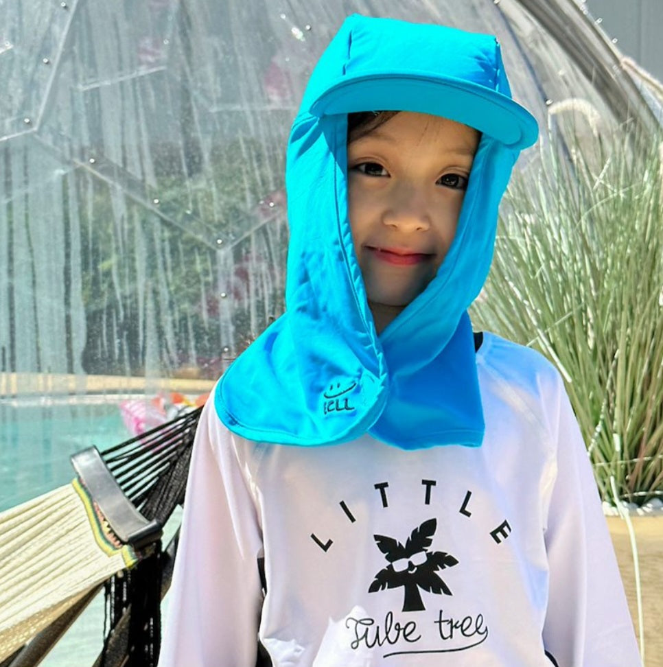 It has a strong brim and a long flap that covers the back of the neck, so it's good for protecting your kid's skin.